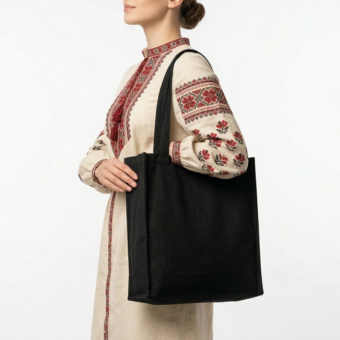 Обираючи чорну сумку-шопер з дном і боками із саржі, ви інвестуєте у власний комфорт, преміальну якість та ефективне просування вашого бренду.