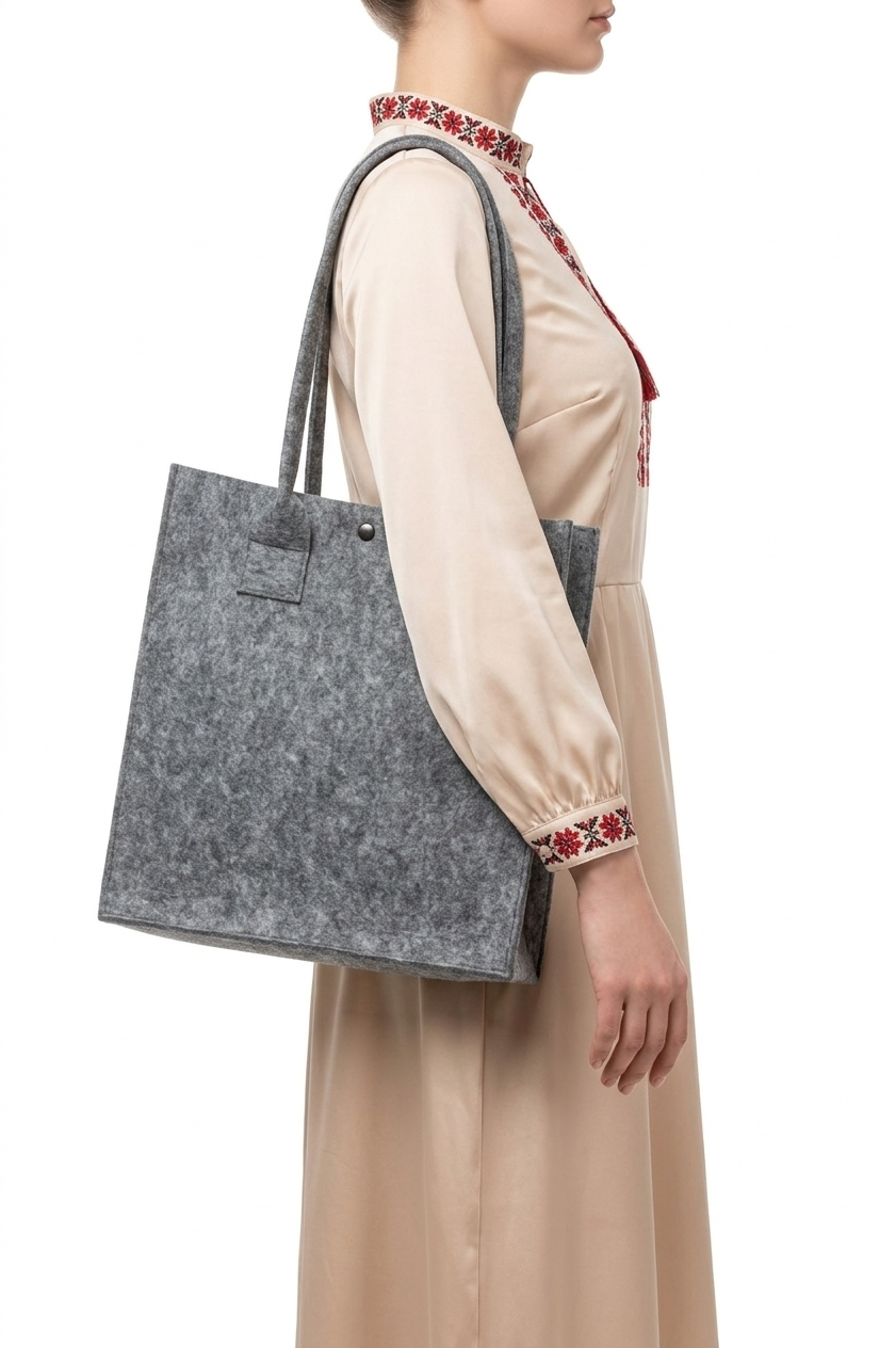 Фетрова сумка — це екологічна альтернатива пластику, яка служить роками. Матеріал легко очищується: невеликі забруднення можна прибрати вологою губкою або щіткою. При необхідності сумка витримує дбайливе ручне прання в прохолодній воді.